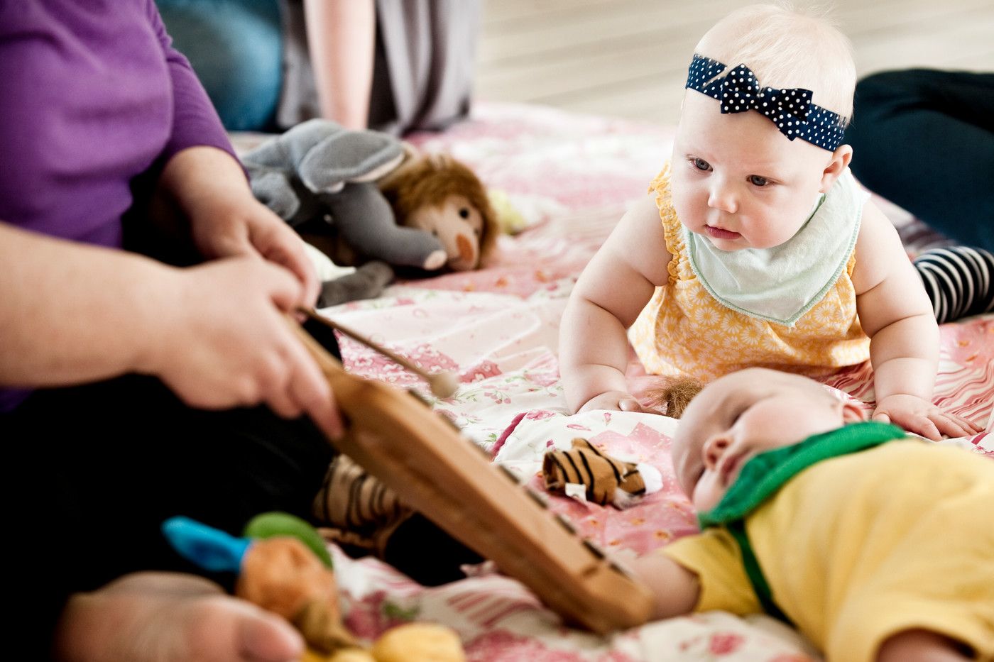 Vi synger, leger, danser og laver remser, blæser sæbebobler og lytter til dejlig musik.