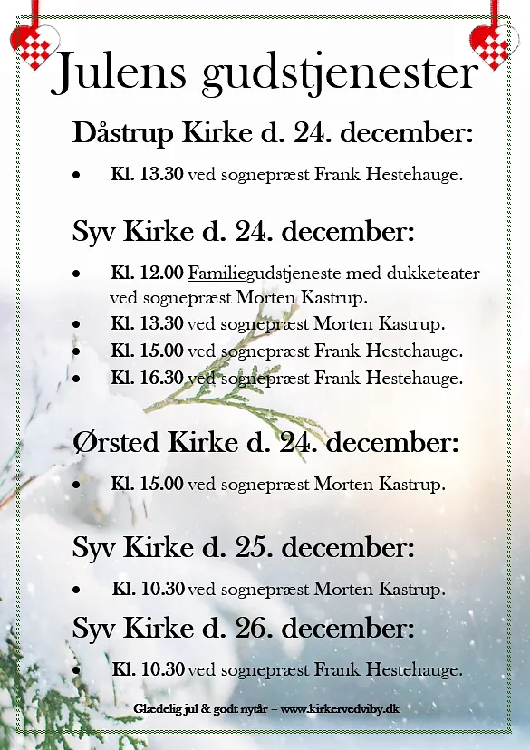 Præsterne i vores pastorat afholder forskellige typer af gudstjenester. Om søndagen afholdes der højmesse kl. 10.30 på skift i vores tre kirker, sommetider er der også indlagt en dåbsgudstjeneste inden højmessen. Derudover afholdes der bl.a. aftengudstjenester "Pusterum", eftermiddagsgudstjenester, plejehjemsgudstjenester, børnegudstjenester og andagter med spisning. Gudstjenesterne bliver altid annonceret i vores kalender her på hjemmesiden, i Kirkenyt og på vores Facebookside "Syv, Ørsted og Dåstrup kirker"